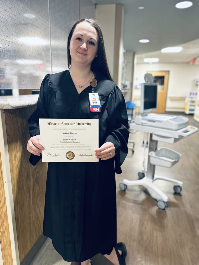 Among those who have taken advantage of the opportunity is Jennifer Fassano, RN. Fassano is the Director of the Emergency Department at Oswego Hospital, was one of 20 employees who received tuition assistance in 2023 to advance their training and education and Oswego Health is proud to share that she graduated from Western Governors University with her Master of Science in Nursing Leadership and Management.